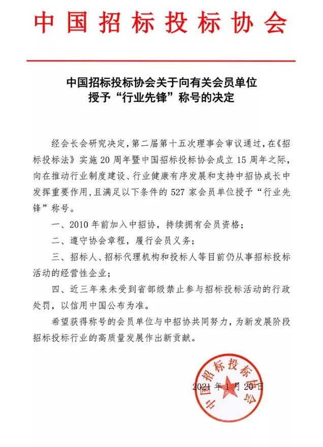 榮膺表彰 | 熱烈祝賀我公司被中國招標投標協(xié)會(huì )授予“行業(yè)先鋒”稱(chēng)號